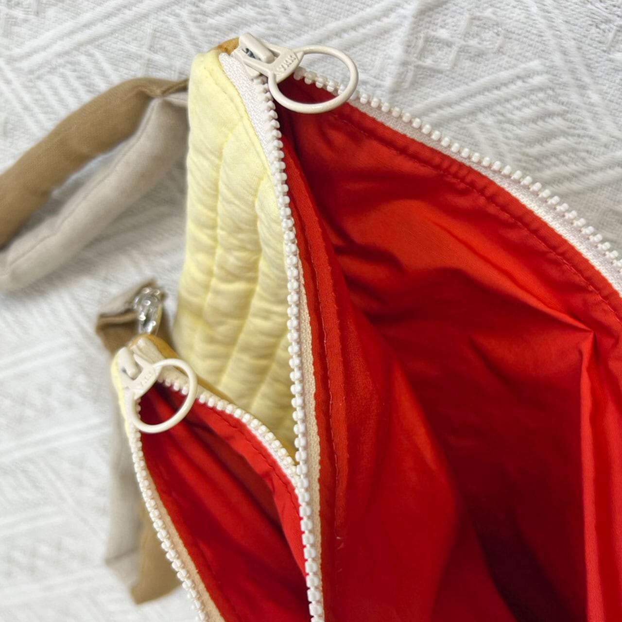 ナチュラルな可愛い配色でどんなコーデにも馴染みます。大きなストラップ付きで目を引くマナーポーチですෆ