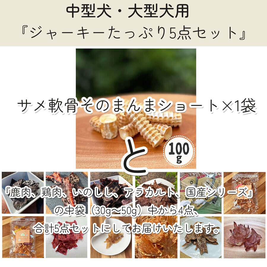 『鹿肉シリーズ、鶏肉シリーズ、アラカルトシリーズ、国産シリーズ』の中袋(30g~50g)中から各1点ずつ、計5点に